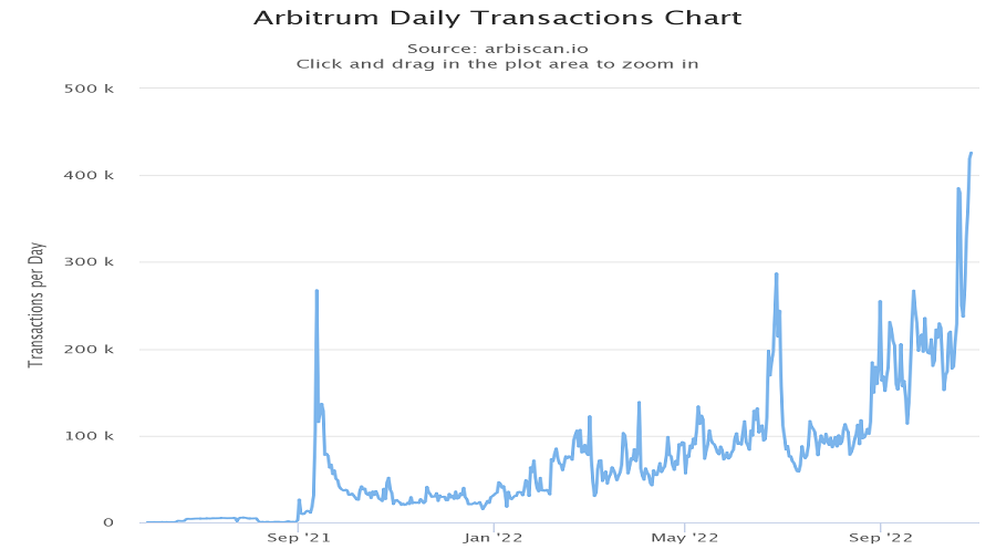 «С 27 октября ежедневное количество транзакций в сети Arbitrum превышает 420 000, что является рекордным показателем. За последние пять дней Arbitrum добавлял более 10 000 адресов в день. Возможно, основная причина в том, что пользователи получают эйрдропы от Aptos», —*написал Колин Ву.