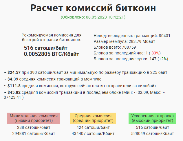 По данным собственного сервиса Bits.media, средняя комиссия за транзакции в сети Биткоина составляет около $24,57, при этом количество неподтвержденных транзакций достигло 80 431. Повышенный спрос на проведение транзакций в сети привел к тому, что 7 мая общая комиссия за блок временно превысила установленное вознаграждение для майнеров в размере 6,25 BTC. Эта награда сокращается вдвое каждые четыре года, после проведения халвинга Биткоина.