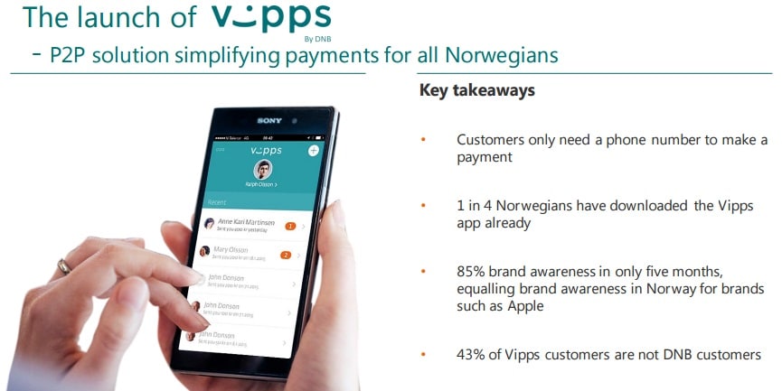 Крупнейший банк Норвегии DNB ASA, более известный как просто DNB, представил новую функцию в своем приложении под названием Vipps, которая позволяет оплатить счета с помощью кредитных карт или банковских счетов. Приложение, работающее по принципу PayPal, может быть использовано для отправки платежей кому угодно в регионе, для этого стоит просто ввести номер телефона, адрес электронной почты или имя пользователя.