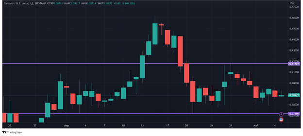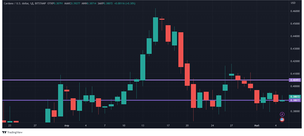 Инвесторы, правда, проигнорировали обновление Cardano. Цена в пятницу, 5 мая, снижается на 0,26%. С точки зрения технического анализа, уровни поддержки и сопротивления с прошлой недели не поменялись*и составляют соответственно: $0,372 и $0,42.