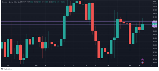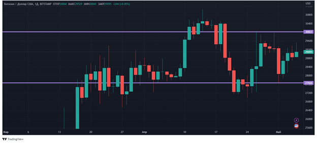 С точки зрения технического анализа, среди биткоин-инвесторов*наблюдается некое затишье без явно выраженного тренда. Уровень сопротивления находится в районе $30*000, уровень поддержки – $27*700.