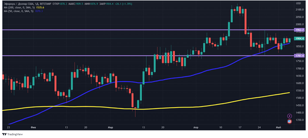 С точки зрения технического анализа, эфир пока находится в боковом движении. Ближайший уровень сопротивления – $1 962,7, ближайший уровень поддержки – $1*787. Положительным сигналом для держателей ETH является тот факт, что монета торгуется выше и 50-дневной скользящей средней (отмечена синим), и 200-дневной (отмечена желтым):