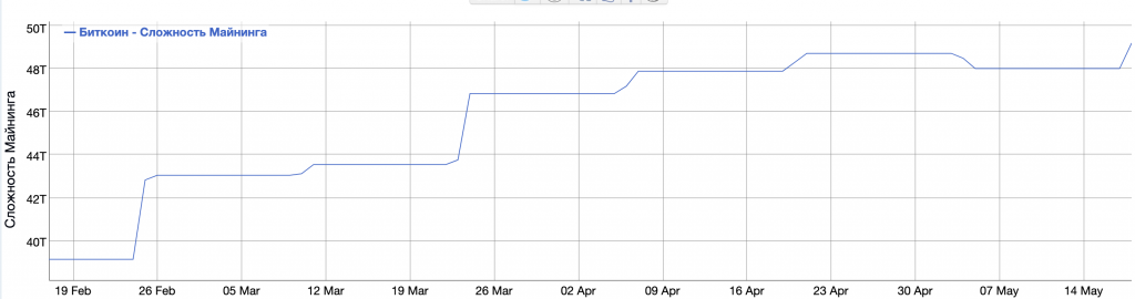 В январе сложность добычи биткоина выросла на 4,68%, обновив исторический максимум на отметке 39,35 трлн хешей. В феврале показатель увеличился еще на 10%, до 43,05 трлн хешей.
